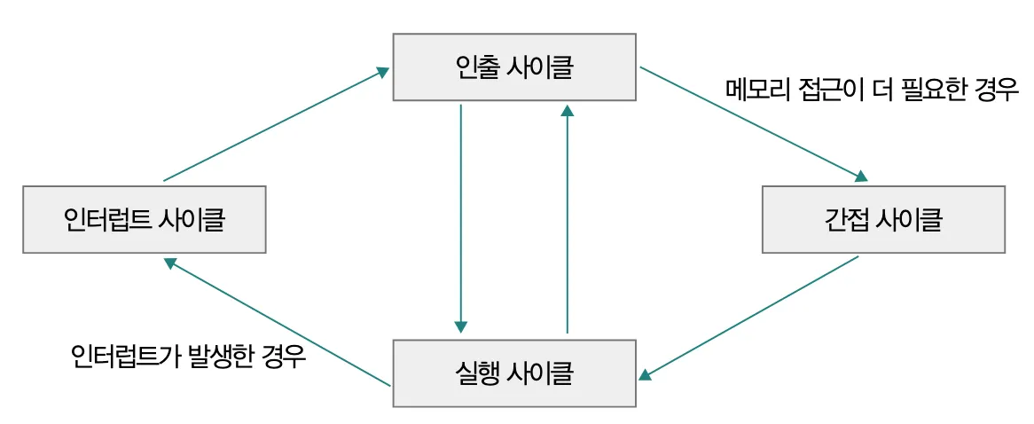 - 간접 사이클 indirect cycle: 메모리 주소가 명시된 경우 명령어 실행을 위해 한번 더 메모리에 접근하는 단계
