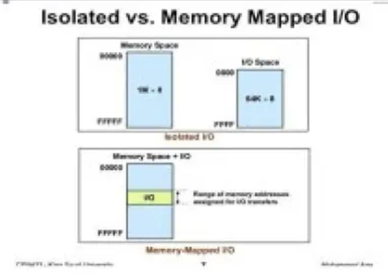 - 고립형(isolated) 입출력: 입출력장치에 접근하려는 주소와 메모리에 접근하는 주소를 별도의 주소 공간으로 간주하는 방식